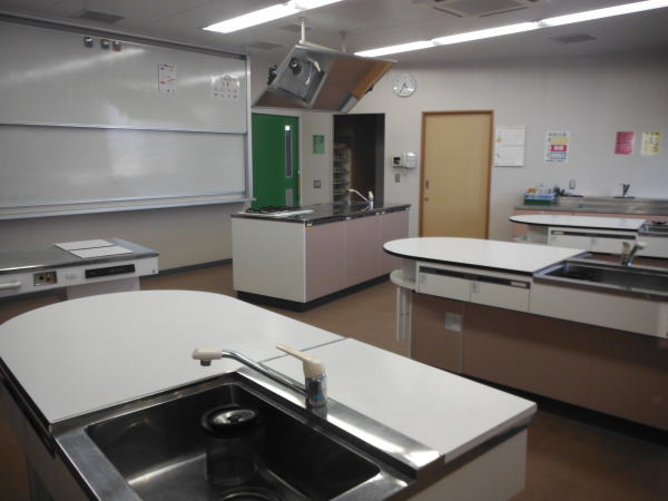 調理台6台を配置するスペースを有し、最大30人の調理実習が可能。調理器具の収納を多くするため、窓下に収納作業台を設けています。また、各調理台に換気設備を設け、バランスの良い換気にも配慮しています。